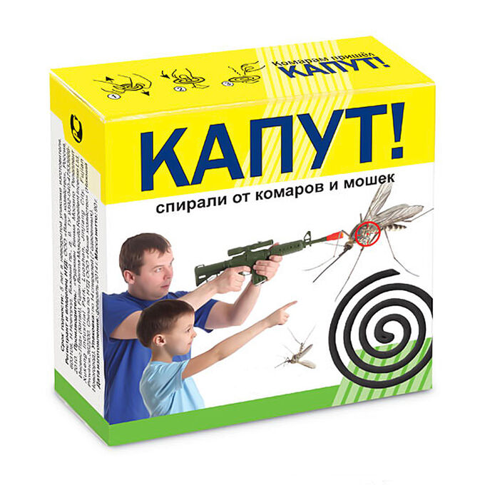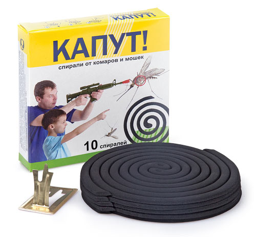 Применение: вскрыть упаковку, достать спираль, поместить ее на прилагаемую металлическую подставку или на невоспла­меняющуюся поверхность (металлическая крышка, блюдце, пепельница), поджечь, пламя задуть и оставить дымить до достижения нужного эффекта, поместив с подветренной стороны. Тление спирали сопровождается выделением незначительного количества дыма. Резерв спирали весом 13 г — до 7 часов. Резерв спирали весом 6,5 г — до 3,5 часа. После полной гибели комаров и других насекомых спираль можно затушить и сохранять для дальнейшего использования. Гибель насекомых в помещении начинается через 1–2 минуты и достигает 100% через 10–15 минут.